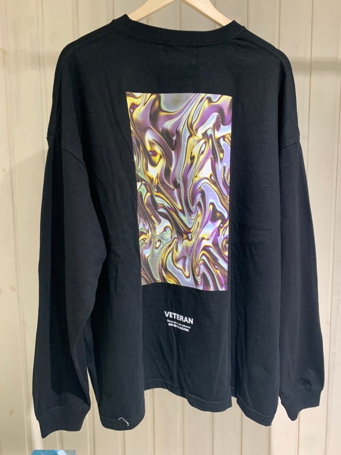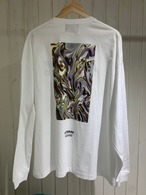 5.6oz のコットン素材。 袖周りのゆとりを大きくもたせ、ほどよくドロップさせた 肩回りと袖丈の長さで絶妙なルーズ感を演出。 背中のグラフィックには、入り混ざった 今の世の中の状況を表現したもの。